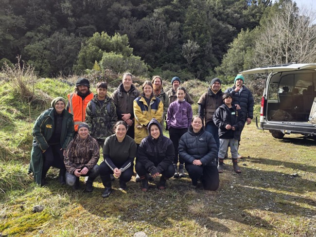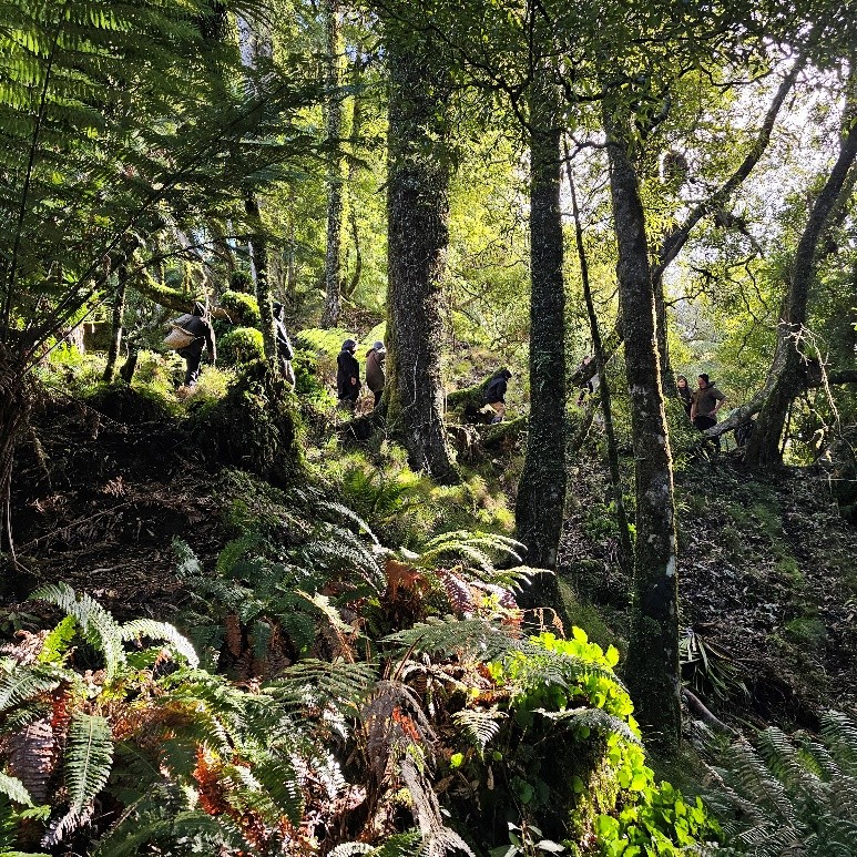 We began with a small pōwhiri at Pukearuhe marae on Saturday morning for the manuhiri from Ahitereiria (The Mahoney/Clarke whānau) and Te Rarama followed by whakawhanaungatanga and lunch. After lunch, a group went out to set up a trap-line for trapping possums. The site chosen for this was just through the Moki tunnel at Tangitu Conservation area. Hunting permits were acquired from DOC for this mahi. A Health & safety plan has been tailored for this event and safety briefings and roll-calls were carried out throughout each field trip.